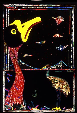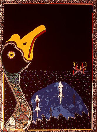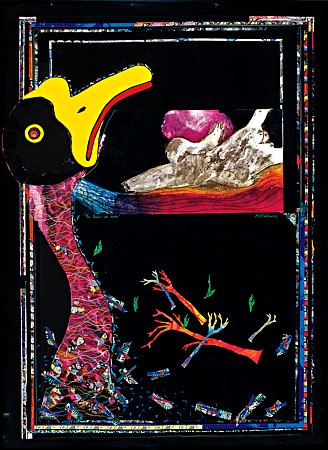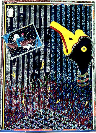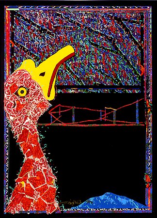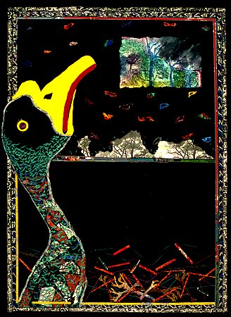 "The Verdict of Archaeology" (1992) responds to The Oakland Firestorm of 1991. Here the duck appears with a decorative mosaic-like green body as it stands watch beside a charred vertical landscape. The top panel includes a microcosm of burning trees amid highly-colored bits of flaming debris. In the center are torn xeroxed photographs of trees in stark, high-contrast black and white emitting an intense nuclear heat. Below are tangled forms floating on a dark field possibly the beginning process of regeneration.