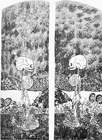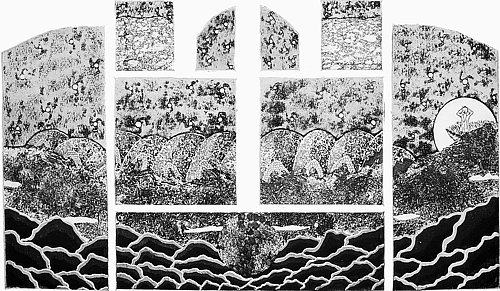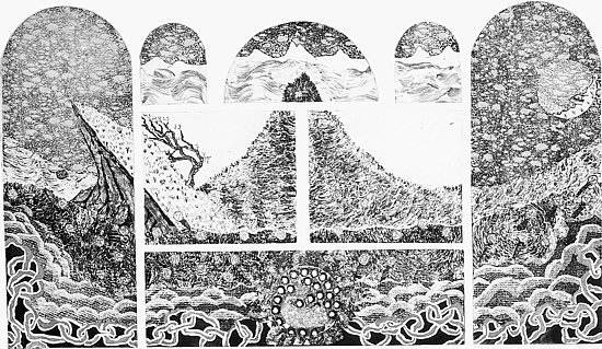 Its companion, "Water Altarpiece," from the same year replaces the human image with an aged and venerable tree, stripped by wind of its foliage in the center of a calamitous landscape of mountain ranges and storm-tossed seas. The question in this eight-part print is whether we are witnessing a great beginning or a tumultuous conclusion of a momentous cosmological occurrence. What is clear, however, is Simons' assimilation of Hokusai's comment.