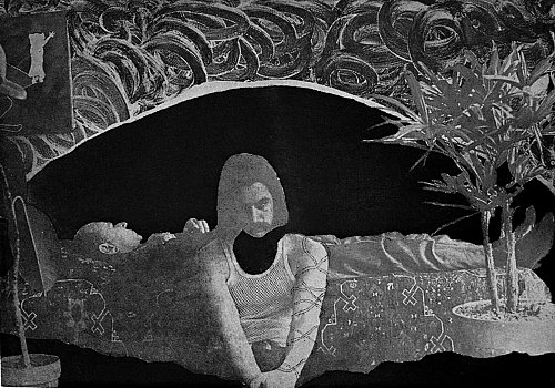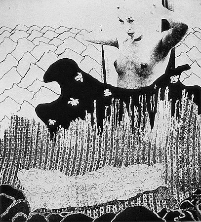 "Here Even Too" (1974), a female figure looms over a flattened vertical landscape rich in textural complexity. Odd cartoonish tree branches intermingle as a pillow-shaped gaseous cloud hovers in the foreground. The woman appears serene, yet her wrists are bound behind her neck. Perhaps this is a Joan of Arc metaphor about to spontaneously ignite. The sense of foreboding and premonition is unmistakable.